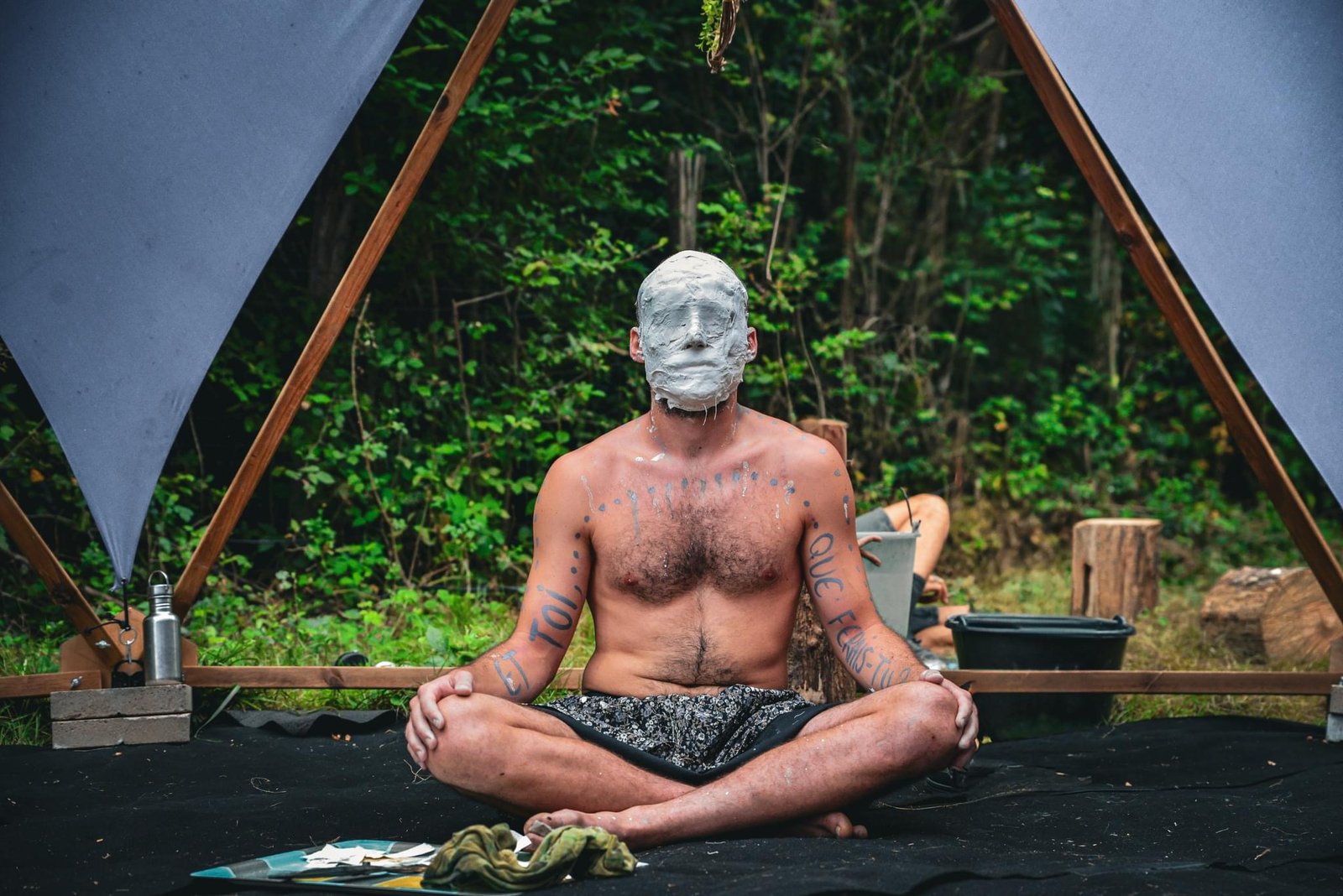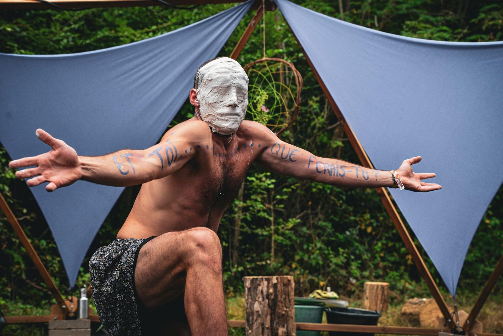 Cette performance collaborative amène le public à déambuler aux côtés du performeur, le visage effacé par un masque de plâtre, créé en live.